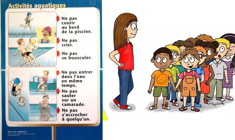 Règles de déplacement piéton, en rang, en car et règles d'or à la piscine. L'activité piscine est l'occasion d'aborder les règles de sécurité au sens large. Le vécu des élèves permet d'ancrer leurs apprentissages dans des situations concrètes.